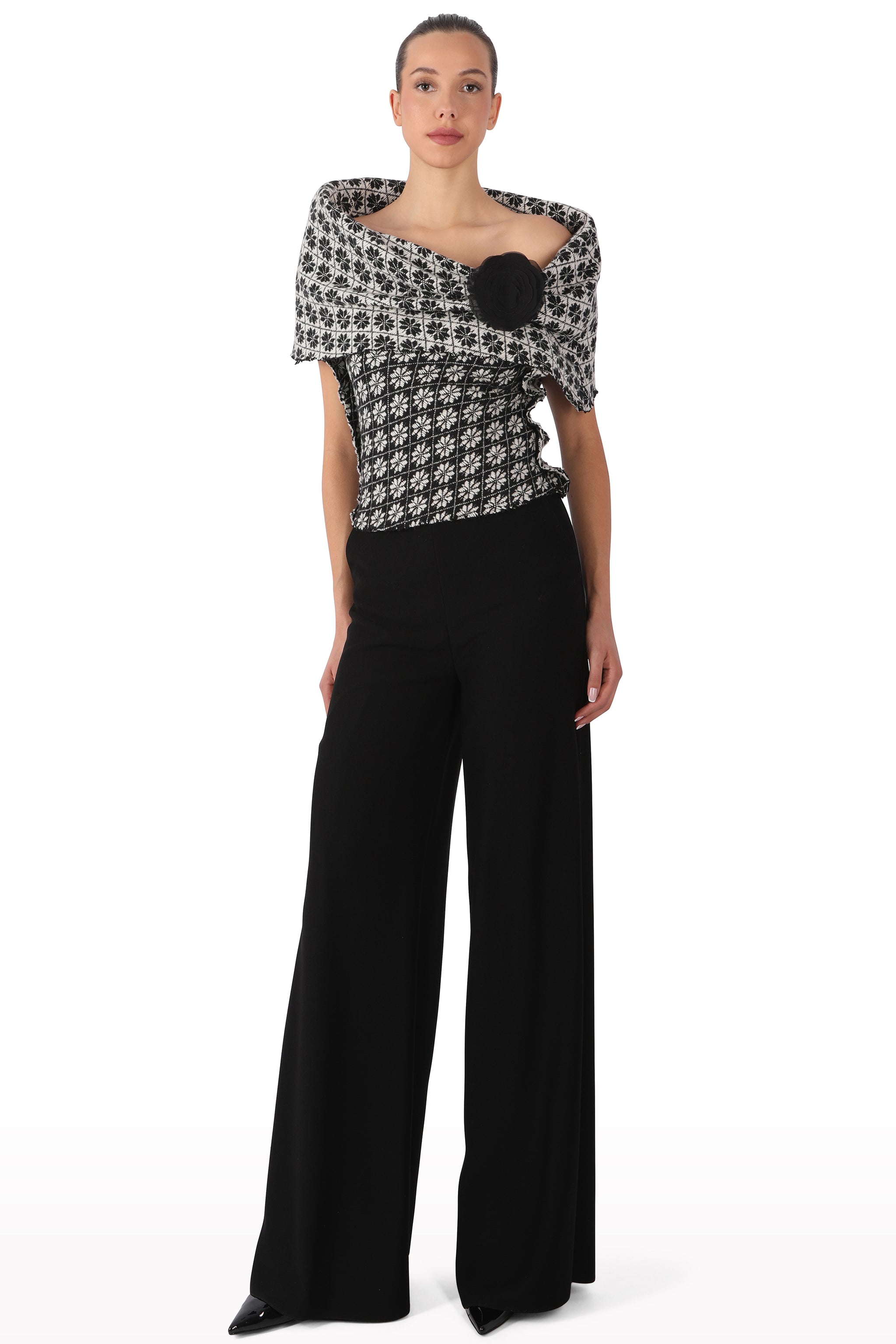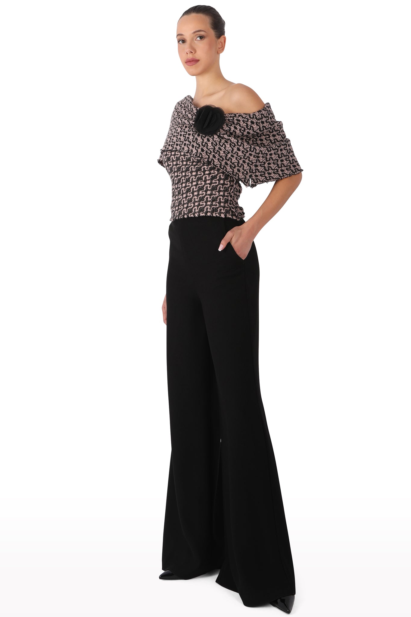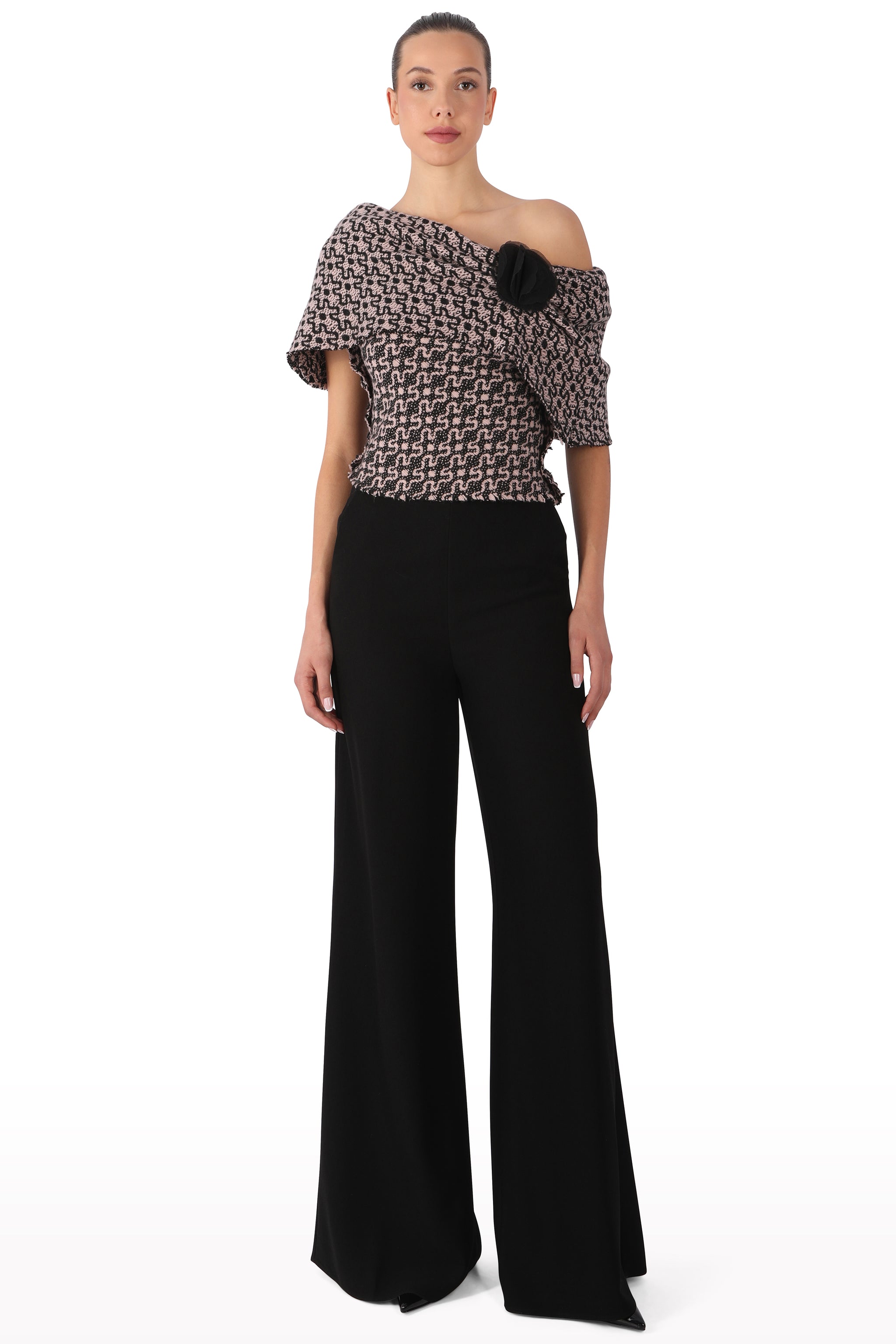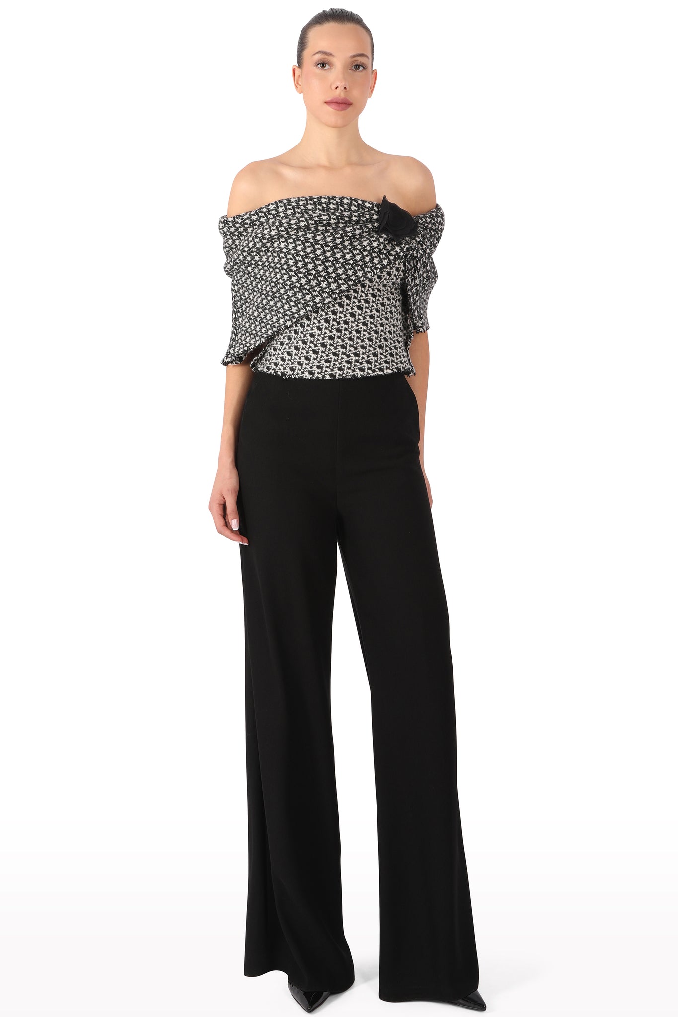 This off-shoulder top is designed with a structured silhouette and a textured woven finish. It features a wide neckline that sits elegantly across the shoulders, with a fitted bodice that creates a defined shape. A fabric flower detail at the front adds a subtle accent.