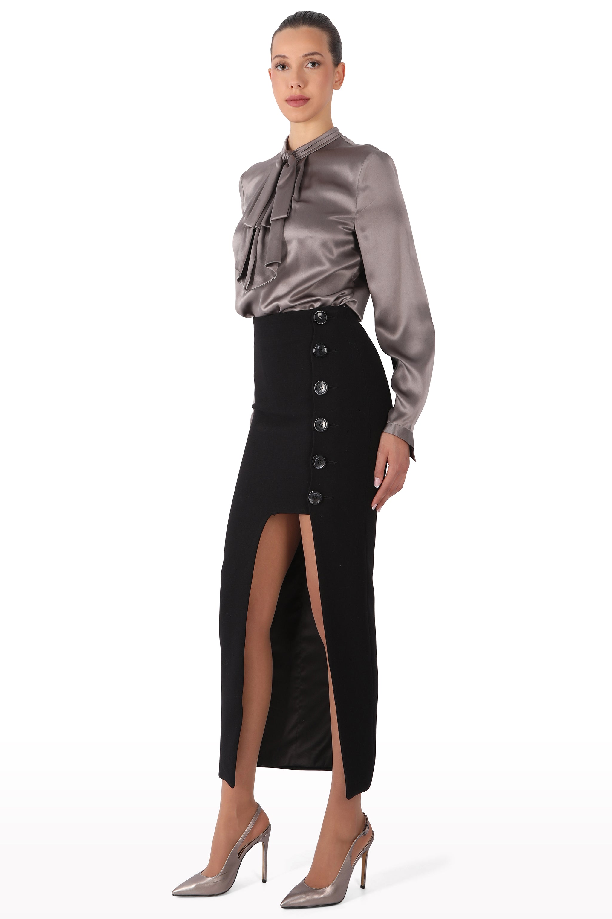 This midi skirt is crafted from poly-rayon stretch fabric with a smooth, structured finish. Designed with a high-rise waist, it features a front slit and a button-detailed side closure that adds subtle definition. The streamlined silhouette makes it an elegant piece suited for both tailored day looks and refined evening styling.