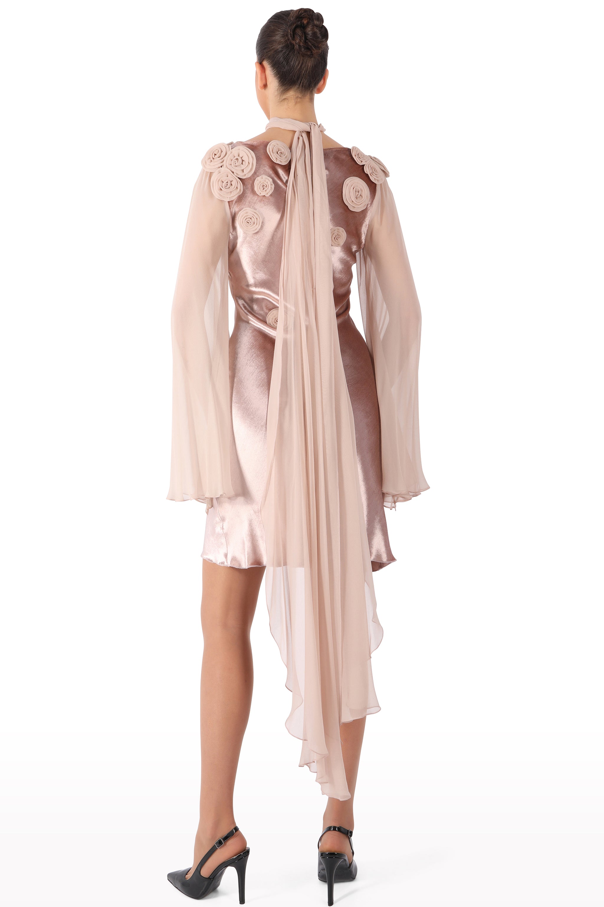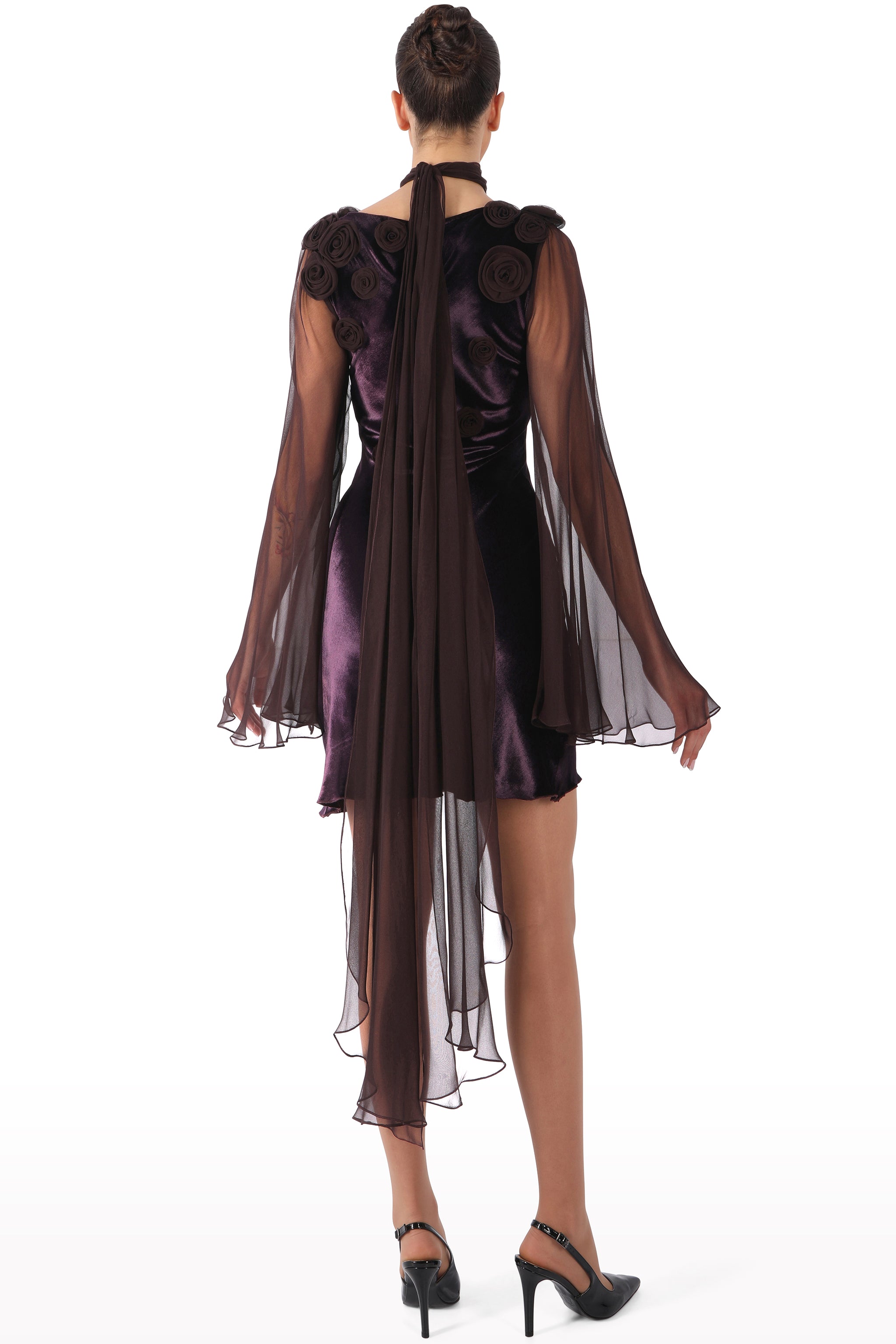This midi dress features a silk velvet body contrasted with sheer silk chiffon sleeves. Designed with a soft V neckline, it is accented by fabric floral appliqués along the neckline and a matching choker detail. The silhouette is finished with a subtle asymmetric hem and long, lightly flared sleeves