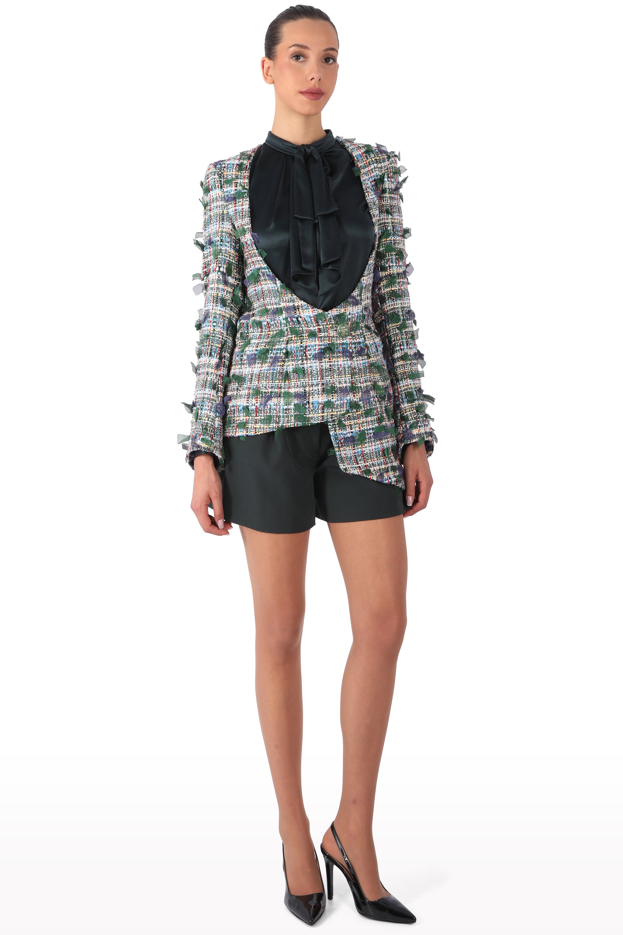 This tailored jacket is crafted from blended cotton tweed, featuring a structured silhouette with a fitted waist and long sleeves. Designed with sheer tulle sleeves for subtle contrast, it is finished with a clean neckline, front button closure, and sharp tailoring throughout.